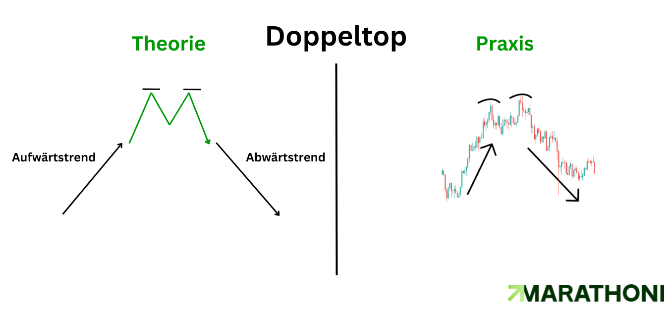 Stop-Loss: Je nachdem, wie die Kerzen sind, bietet sich ein Stop Loss über dem Double Top an. Sollte dieser weiter weg liegen und nicht zum Management passen, kann der SL zwischen Top und der horizontalen Linie gelegt werden.