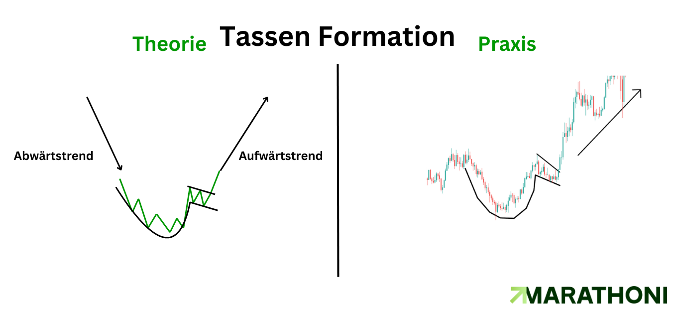 Bestätigung: Gerade bei diesen runden, etwas längeren Formationen brauchst Du aber zwingend eine Bestätigung, um nicht in eine Falle zu tappen. Achte hier unbedingt auf ein ansteigendes Volumen beim Durchbruch aus dem Henkel.