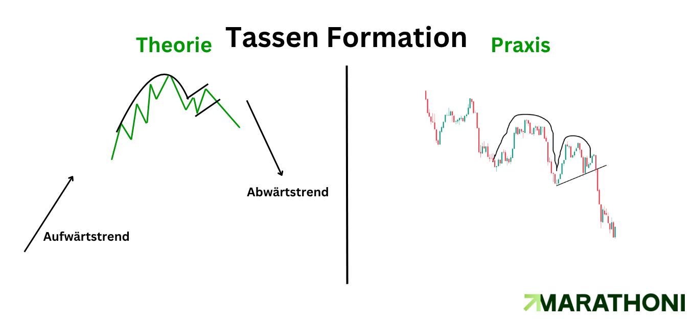 Signal: Ein Short-Signal entsteht, wenn der Kurs nach der Bildung des umgedrehten Henkels mit hohem Momentum unter die untere Unterstützung bricht. Auch hier ist ein deutlicher Volumenanstieg beim Ausbruch die absolute Regel.