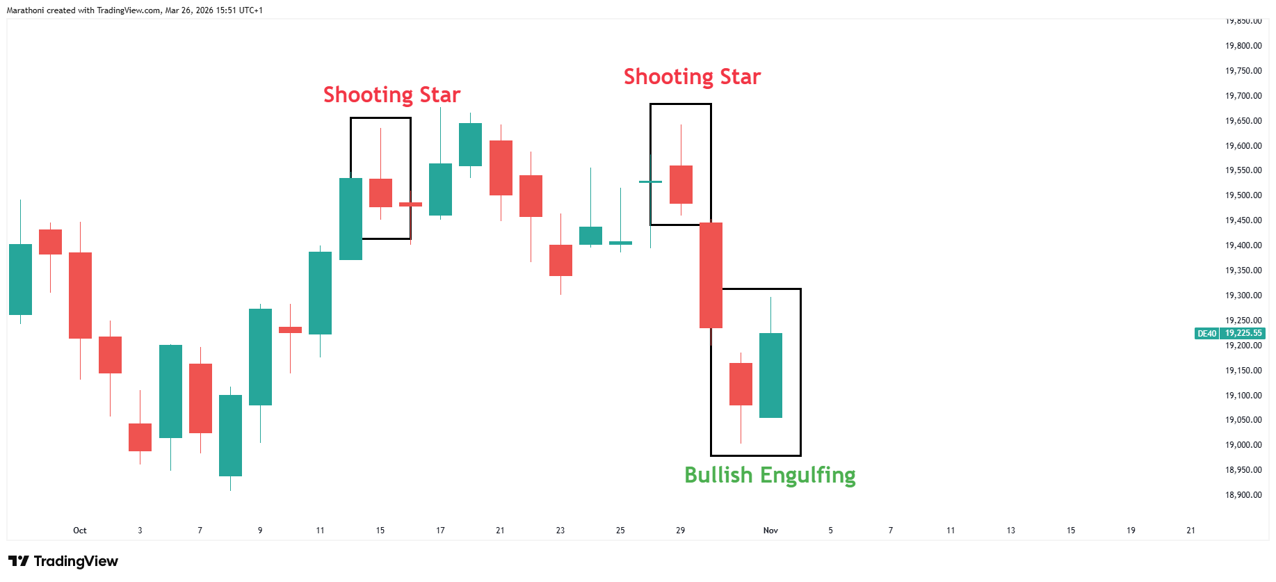 Chartmuster brauchen Zeit, um sich zu entwickeln. Kerzenmuster (Candlestick Patterns) hingegen sind das „Mikroskop“ der Technischen Analyse. Sie bestehen meist nur aus 1–5 Kerzen und zeigen uns den unmittelbaren Kampf zwischen Bullen und Bären in einer sehr kurzen Zeitspanne.