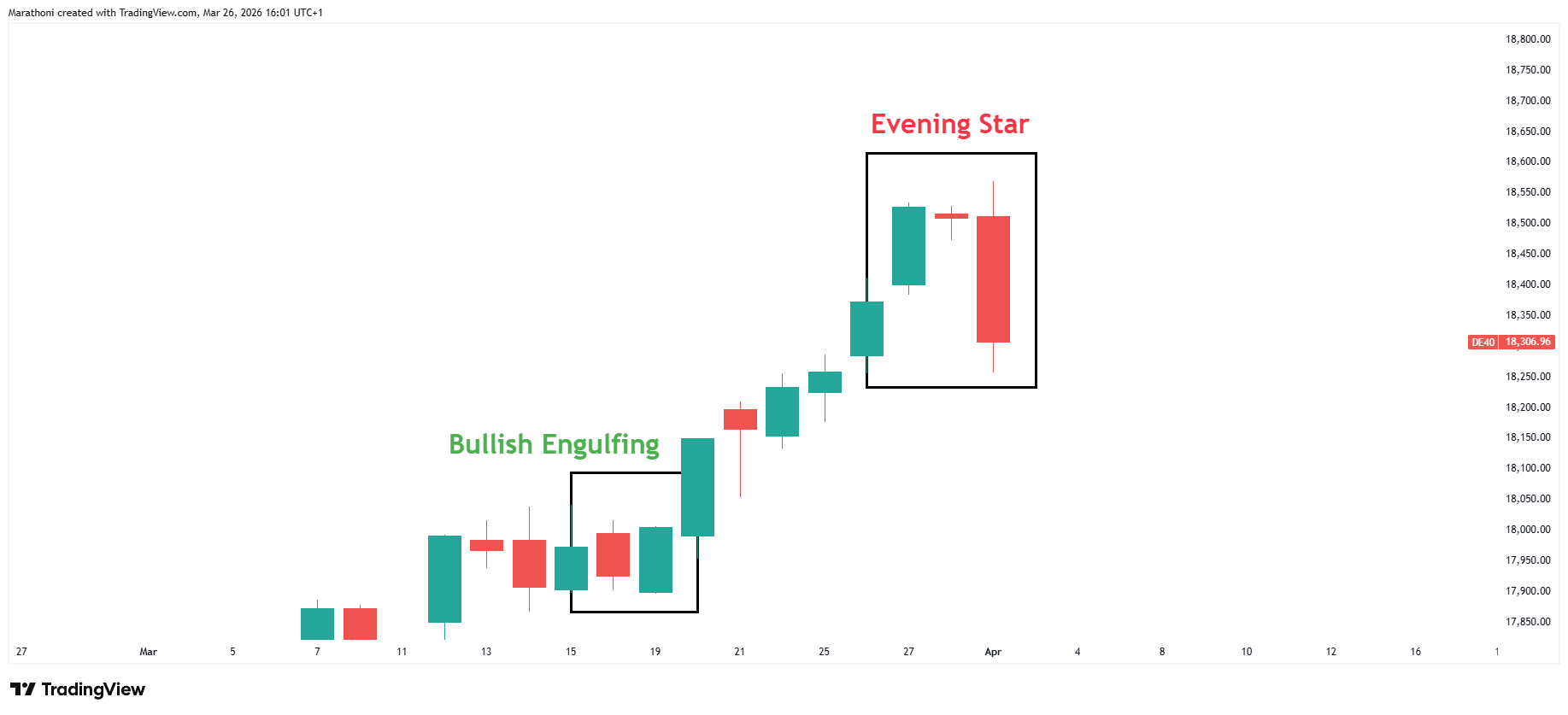 Du kannst das Ganze sehr vielseitig einsetzen. Wie oben beschrieben, für das Timen von besseren Einstiegen. Jedoch auch für das Setzen eines Stop-Loss. Du kannst das Ganze zum Beispiel mit Unterstützungszonen super kombinieren. Als kleines Beispiel stell Dir vor, Du willst Short gehen und an einer Widerstandszone ergibt sich ein Evening Star. Das kann Dir extrem helfen.