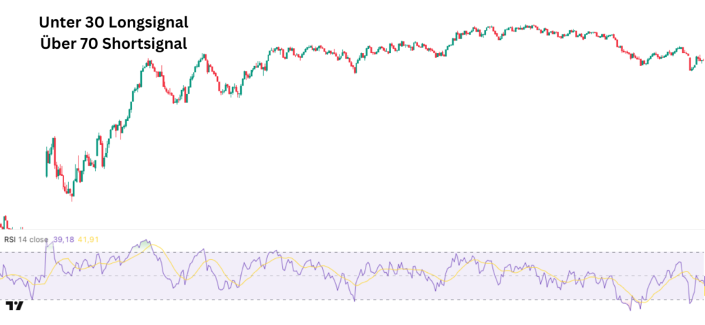 Der RSI, dieser pendelt zwischen 0 und 100 und misst die Geschwindigkeit und Veränderung der Preisbewegung.