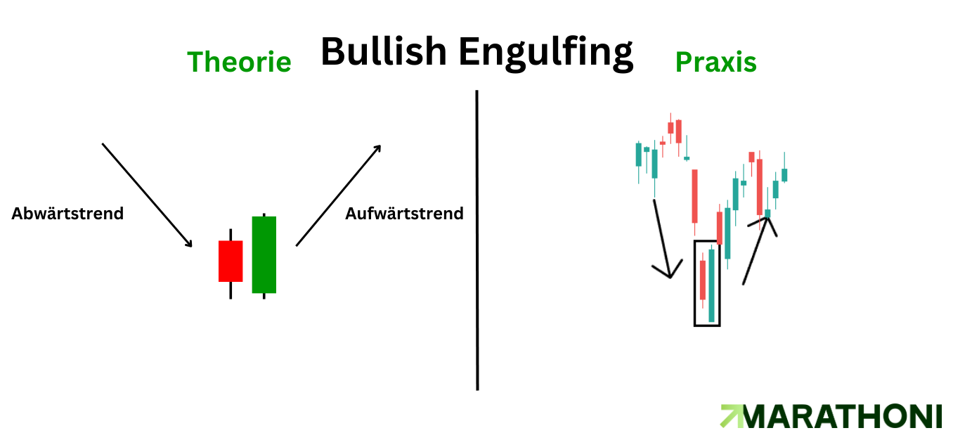 Das Engulfing-Muster besteht aus insgesamt zwei aufeinander folgenden Kerzen. Wichtig ist hierbei, dass die zweite Kerze den gesamten Körper der ersten Kerze umschließt. Ein weiterer wichtiger Punkt ist, dass die beiden Kerzen eine unterschiedliche Farbe haben, um das Muster zu bilden. Beim Bullish Engulfing ist die zweite Kerze eine grüne Kerze.