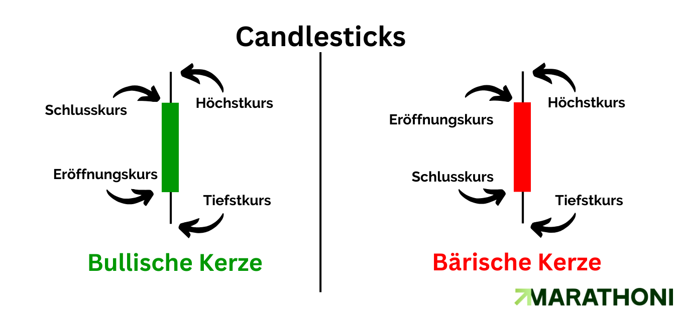 Bullische Kerze: Die bullische Kerze ergibt sich aus dem Schlusskurs, dieser liegt über dem Eröffnungskurs und ist grün. Das kommt zustande, da die Kerze innerhalb der Eröffnung und dem Schluss einen Kursgewinn verzeichnen kann.