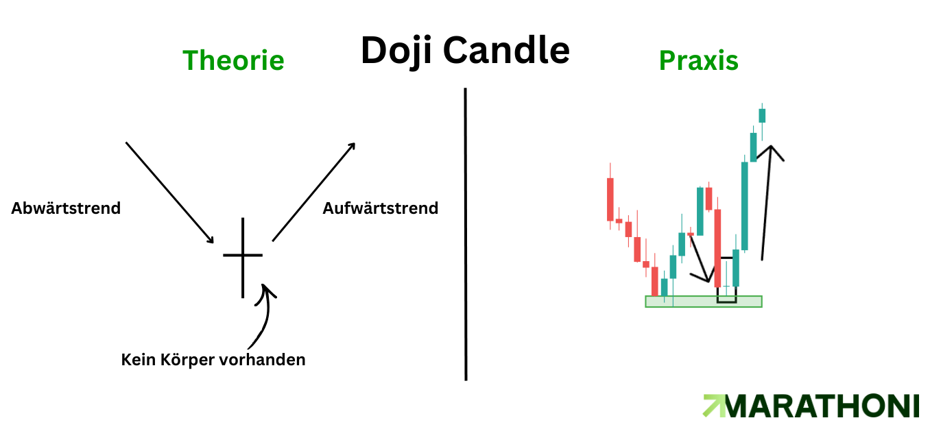 Das Doji ist eine Kerze, welche so gut wie keinen Körper aufweist. Hier ist es so, dass Anfangs- und Schlusskurs fast auf einem Preis liegen.