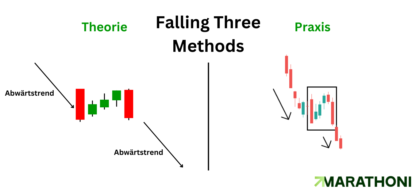Bei dem Muster handelt es sich auch wieder um ein Muster, welches für eine Trendfortsetzung spricht. Wie der Name schon sagt, geht es hier um eine Fortsetzung des Abwärtstrends. Die erste Kerze ist eine bärische Kerze, welche von drei bullischen Kerzen gefolgt wird. Trotz der Stärke bekommen die Verkäufer die Oberhand und schließen die vierte Kerze unter der ersten roten.