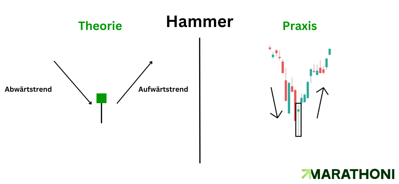 Ähnliche Muster: Eine Formation bzw. Kerze, die dem Dragonfly Doji ähnlich sieht, ist die „Hammer-Kerze“. Der Unterschied ist hier jedoch die Größe des Kerzenkörpers.