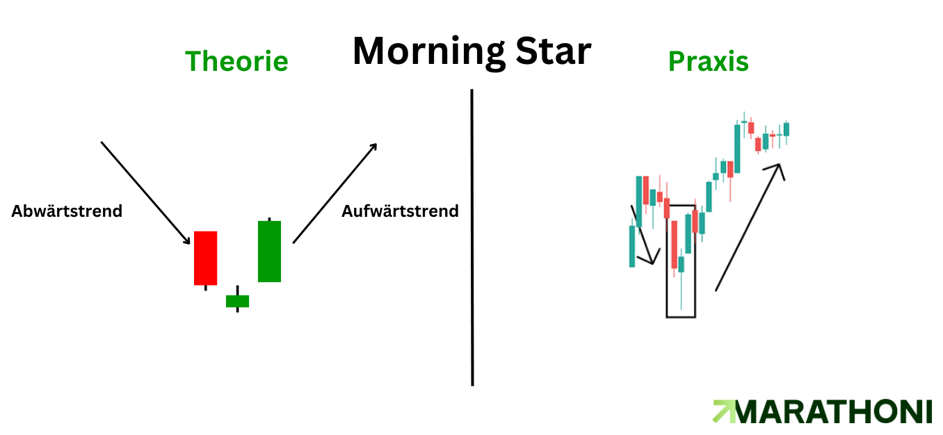 Der Morning Star ist ein Muster, das aus drei Kerzen besteht und ein Umkehrmuster ist. Das Muster beginnt mit einer roten Kerze, gefolgt von einer kleineren grünen Kerze, oftmals mit einer Lunte auf der Unterseite. Die dritte Kerze ist sehr bullisch ausgeprägt.