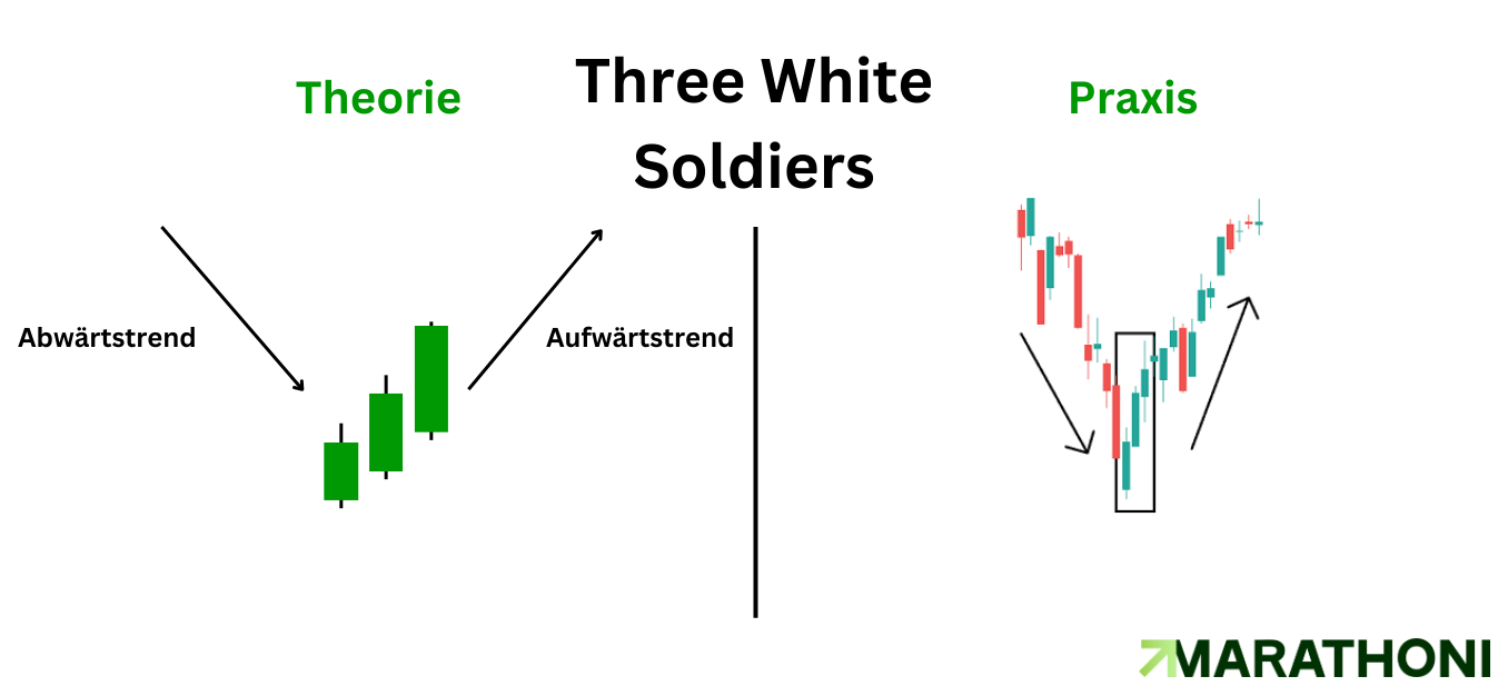 Dieses Muster zeigt drei starke bullische (grüne) Kerzen hintereinander. Das Wichtige hier ist, dass die folgende Kerze immer über dem Schlusskurs der vorherigen schließt. Das spricht dann für Stärke und für die Käufer.